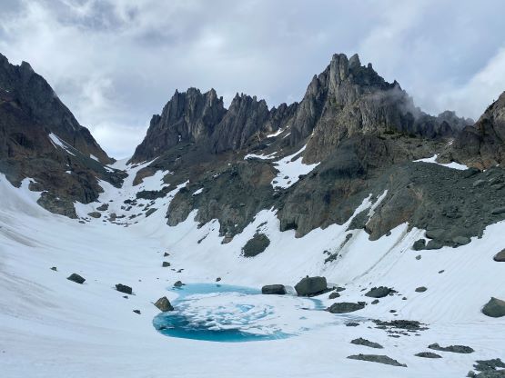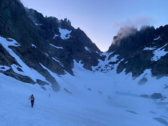 The decision was made to keep the original plan to ascend Mt. Clark and I assured the team that we shouldn’t worry too much about time. If needed I could lead us back in the dark, even though I’d rather not to do so. Nonetheless we plodded across the few annoying moraines at a racing pace and ascended into the upper valley where we found some permanent snow fields. The lower section of Mt. Clark’s approach was not pleasant, but the snow travel in the upper valley was very cruisy. Elise and I took turn kicking steps all the way to Clark/Johnson col. The col might seem to be close, but was actually quite far away with substantial amount of elevation to gain. That’s good because we wanted to dispatch as much elevation on snow as possible, as the travel on snow is always faster than on rocks. The clouds ceiling had dropped such that we were in some intermittent white-outs, but I could also see blue skies to the west. There’s a good chance we would not get any view, but this was the type of weather that if we did get lucky we could end up getting some epic views.