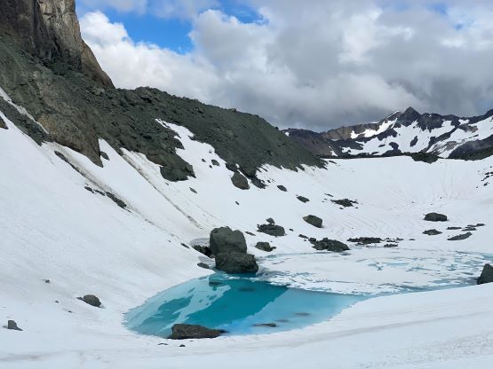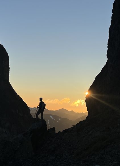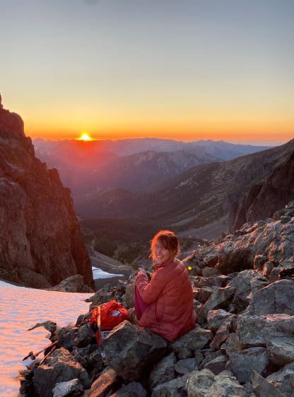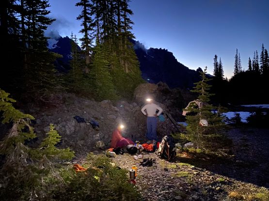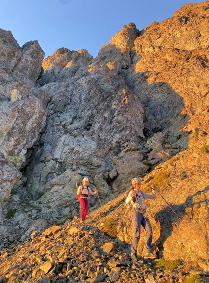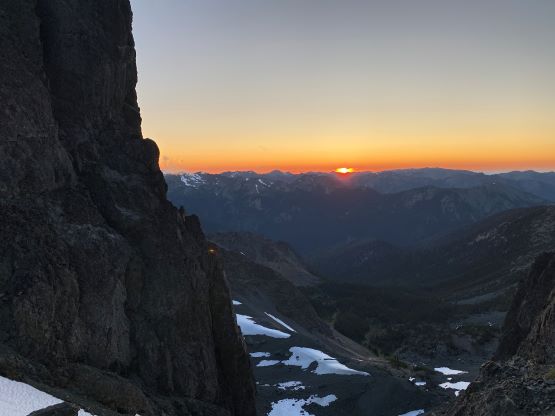 On the descent all we needed was to retrace what exactly we did on the ascent. The down-climb of the summit block as well as the north side slopes required caution and we made sure to take our time. The re-ascent of the 3rd class slabs felt like a joke by comparison and in no time we were back down to easier terrain. Instead of rushing down to camp we opted to watch sunset from Clark/Johnson col, which necessitated over 20 minutes of waiting. Meanwhile we caught some Canadian receptions which I still do not understand how. The girls were always busy on their phones as they opted to pay roaming in the U.S. I almost never do that, but since there’s Canadian reception I also turned off the airplane mode and made some socials update. After the sun came down we rushed back to camp in under half an hour, beating headlamps time. I thought we definitely needed to descend the confusing moraines with head-lamps but that wasn’t the case. The mosquitoes that we encountered earlier in the day had mostly gone so the evening routine was actually enjoyable. I focused on cooking while Mel and Elise got the tarp tent set up. It was meant for 2 people but we managed to squeeze 3 in, easily. To travel light we also did not bring the mesh so we were very thankful that the mosquitoes hadn’t fully come out yet. On the following day we would ascend Mt. Deception, the primary objective of this trip.