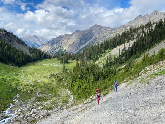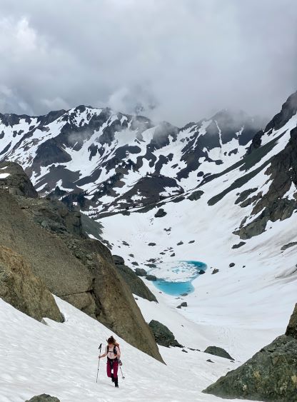 Elise plodding up towards Johnson/Clark col. The view is very foreshortened
