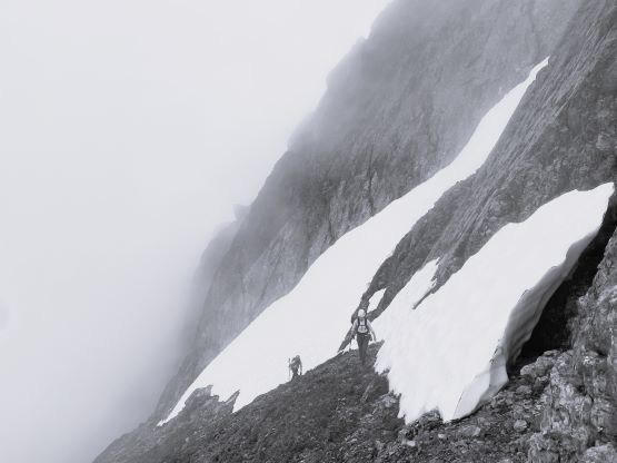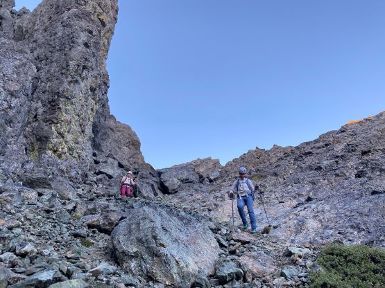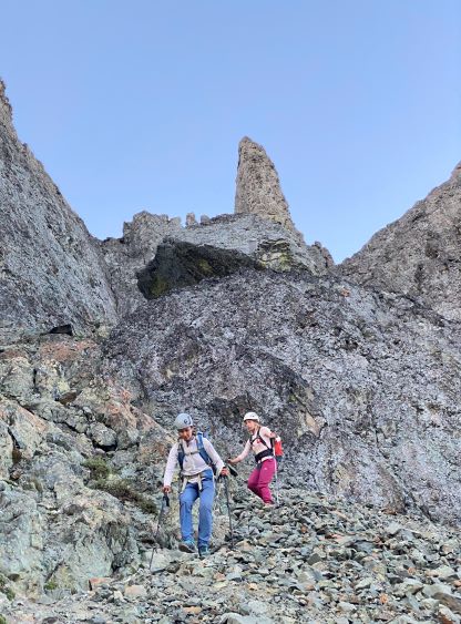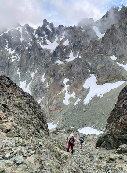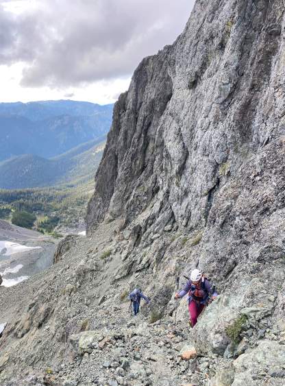 Gingerly descending the loose gully. Rockfall is a real hazard here…