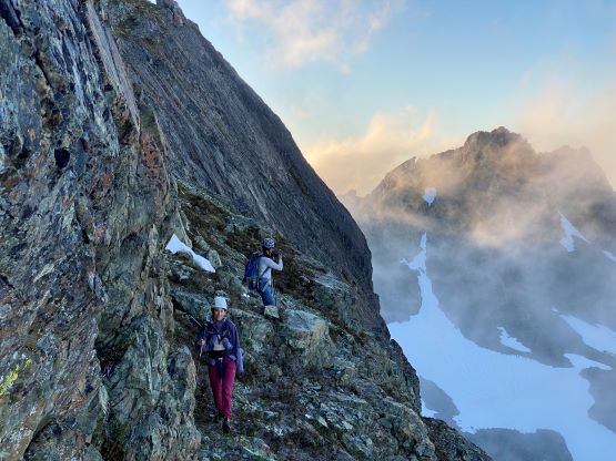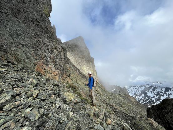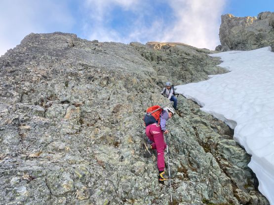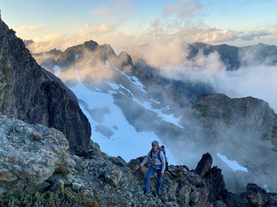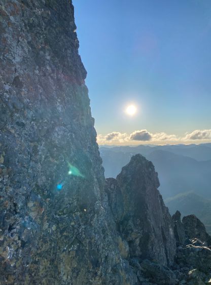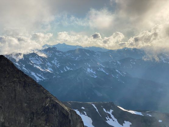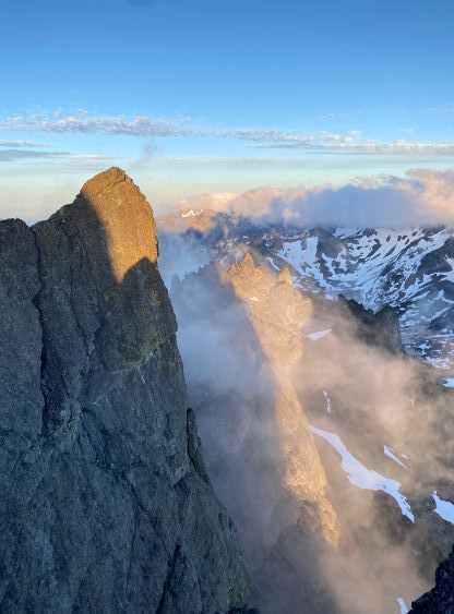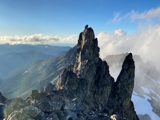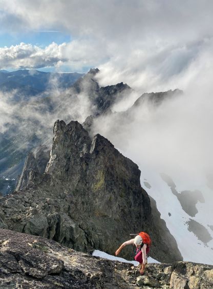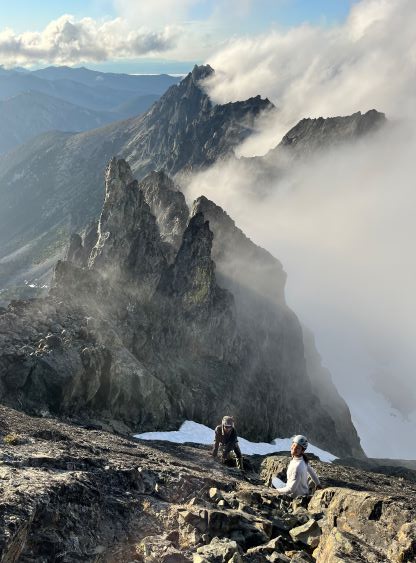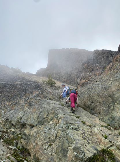 After taking a mandatory break at Clark/Johnson col ditching some gears we resumed on. The key traversing ledge was easy to locate and was very easy to scramble across. The ledge was wide enough that exposure could not be felt. The ledge terminates into a wide, chossy gully and we easily scrambled the entire length of this gully onto the SE Ridge where we faced the first “crux” of this route, the exposed 3rd class down-climbing on slabs. I immediately located the break in the slabs and dropped in. Other than one awkward spot near the bottom I did not find this to be “cruxy” at all. Elise and Mel also thought this slab to be rather tame. We brought crampons and ice axes all the way to the north side of the corkscrew route because I had read in some reports where people got turned around by unexpected snow on the ledges. June is still considered “early season” for this scramble, but on this day the route was entirely snow free. We did encounter some patches of snow on the east side ledges but the those could all be easily avoided. Upon reaching the snow-filled gully on the north side of the summit we scrambled the adjacent rocks (sustained class 3) on climber’s left side of the snow, all the way to the summit block. The summit monolith fortunately had a break in the middle offering a class 3/4 route up, as otherwise one would definitely need to rock-climb to reach the highest point. We got extremely lucky with weather and we spent over 20 minutes on the summit (barely enough room for three people).