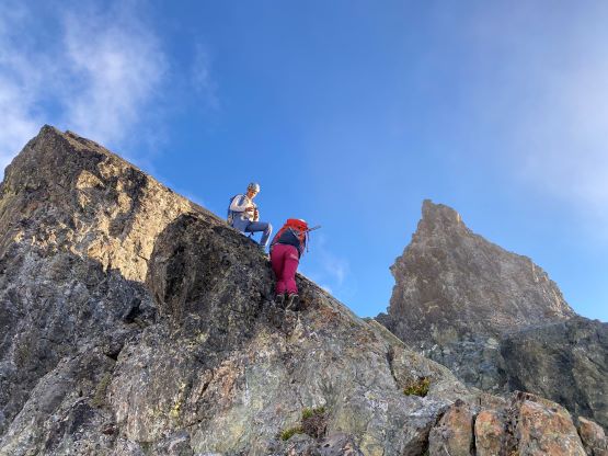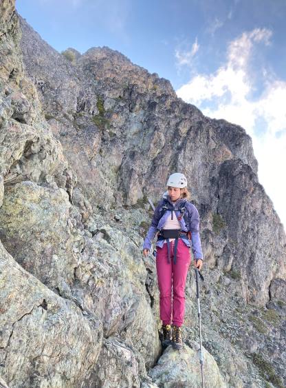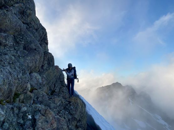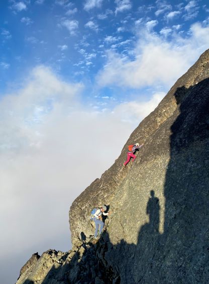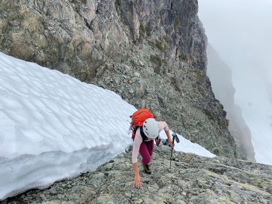 Mel popping out onto the SE Ridge after re-ascending the slabs