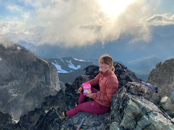 Mel on the summit of Mt. Clark with Mt. Johnson behind