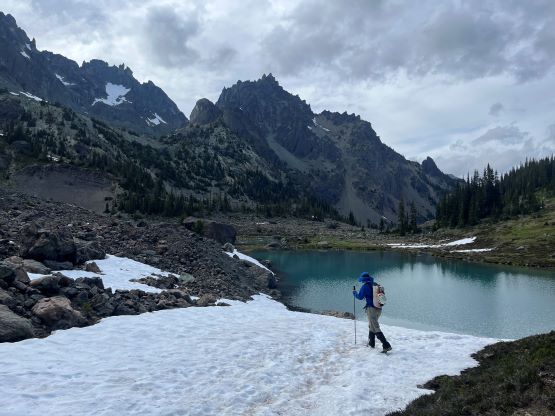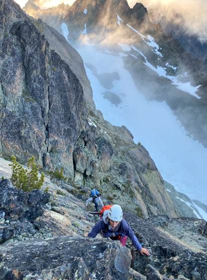 Mt. Clark is a pointy summit in the Olympics accessed from Royal Basin. It might be overshadowed by the nearby Mt. Deception which is the second highest and the second most prominent in the entire Olympics, but the scrambling on Mt. Clark is considerably more fun and more challenging. There exists only one route that makes sense, the “corkscrew route” that starts from Clark/Johnson col, works around the south and east sides on ledges and eventually finishes by an exposed class 3/4 scramble on the north side of the summit block. Mel had a recent fever with Mt. Deception but the only way for me to come along was to do it over 2 days with a camp in Royal Basin. Mel had never camped in her entire peak-bagging career but Elise and I somehow convinced her. We only had 2 days “home to home” so I wasn’t quite sure if we’d have enough time for a secondary objective, namely Mt. Clark, but we agreed to give it an attempt if we could get to the basin before 6 pm. I estimated that we had at most 50% chance.