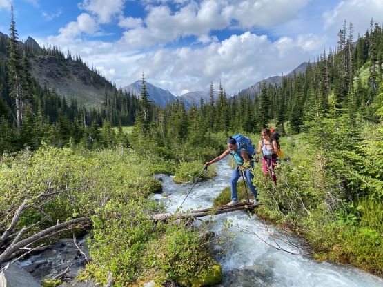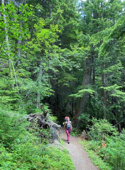 Mel and Elise showed up in my home at around 8:30 am and the border crossing was without event. I then drove us down to Coupeville ferry terminal as I had already reserved the 11:45 am ride for us. The ferry was decently busy due to the upcoming long weekend but we had the reservation so we boarded the boat without a problem. We had also obtained and printed the camping permit so we drove straight to the Upper Dungeness trail-head, which was about 1.5 hours from Port Townsend. The final stretch of this access road was gravel with lots of pot-holes and that’s why I drove us there in the Tacoma. I definitely did not regret about this decision as a car could probably make it, but would definitely struggle. The trail-head was stupidly busy but most of the folks were solely interested in hiking and camping. We eventually had both Mt. Clark and Mt. Deception to ourselves. By 2:15 pm we were able to start the approach carrying the heavy ass packs. Even though we didn’t bring a rope nor harnesses we still needed to carry mountaineering boots, ice axes and crampons and those were not light.