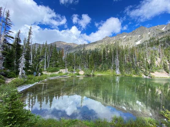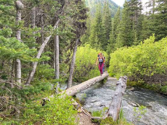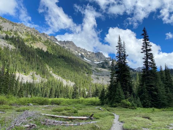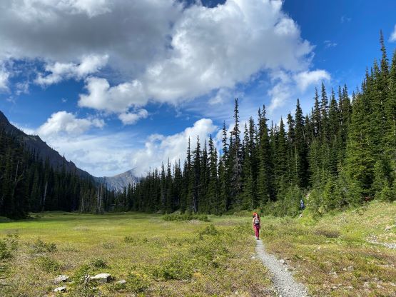Since the border and the ferry both went without a delay we decided to push the pace to attempt Mt. Clark. Part of me was hoping for a leisure approach hike as I was very tired from the recent trips but we are stubborn peak-baggers that could not easily give up bagging a secondary summit. I knew the girls were fast on trails so I went ahead to set a steady pace that I felt comfortable about. The trail does dispatch quite a lot of the elevation gain which I didn’t realize until I was there doing the approach. By the time we got to Royal Lake we had already gained 800 m elevation. The trail does involve some annoying up-and-downs that we sure would not appreciate on the return, but let’s worry about that later. We didn’t bother to make a stop at Royal Lake despite the scenery, but immediately carried on towards the upper basin with an additional 200 m elevation gain. This stretch was also very scenic and the trail quality was also excellent except for one creek crossing done on logs. It took us over 3 hours to get here so we were definitely pressed on time. After finding a perfect camping spot we immediately ditched the overnight gears, repacked and changed footwear to mountaineering boots. It was 6:02 pm and we had about 3.5 hours of daylight.