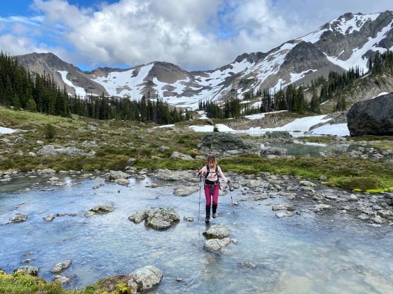 Since the border and the ferry both went without a delay we decided to push the pace to attempt Mt. Clark. Part of me was hoping for a leisure approach hike as I was very tired from the recent trips but we are stubborn peak-baggers that could not easily give up bagging a secondary summit. I knew the girls were fast on trails so I went ahead to set a steady pace that I felt comfortable about. The trail does dispatch quite a lot of the elevation gain which I didn’t realize until I was there doing the approach. By the time we got to Royal Lake we had already gained 800 m elevation. The trail does involve some annoying up-and-downs that we sure would not appreciate on the return, but let’s worry about that later. We didn’t bother to make a stop at Royal Lake despite the scenery, but immediately carried on towards the upper basin with an additional 200 m elevation gain. This stretch was also very scenic and the trail quality was also excellent except for one creek crossing done on logs. It took us over 3 hours to get here so we were definitely pressed on time. After finding a perfect camping spot we immediately ditched the overnight gears, repacked and changed footwear to mountaineering boots. It was 6:02 pm and we had about 3.5 hours of daylight.