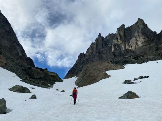 Elise plodding up towards Johnson/Clark col. The view is very foreshortened