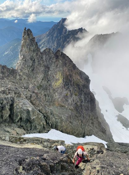 After taking a mandatory break at Clark/Johnson col ditching some gears we resumed on. The key traversing ledge was easy to locate and was very easy to scramble across. The ledge was wide enough that exposure could not be felt. The ledge terminates into a wide, chossy gully and we easily scrambled the entire length of this gully onto the SE Ridge where we faced the first “crux” of this route, the exposed 3rd class down-climbing on slabs. I immediately located the break in the slabs and dropped in. Other than one awkward spot near the bottom I did not find this to be “cruxy” at all. Elise and Mel also thought this slab to be rather tame. We brought crampons and ice axes all the way to the north side of the corkscrew route because I had read in some reports where people got turned around by unexpected snow on the ledges. June is still considered “early season” for this scramble, but on this day the route was entirely snow free. We did encounter some patches of snow on the east side ledges but the those could all be easily avoided. Upon reaching the snow-filled gully on the north side of the summit we scrambled the adjacent rocks (sustained class 3) on climber’s left side of the snow, all the way to the summit block. The summit monolith fortunately had a break in the middle offering a class 3/4 route up, as otherwise one would definitely need to rock-climb to reach the highest point. We got extremely lucky with weather and we spent over 20 minutes on the summit (barely enough room for three people).