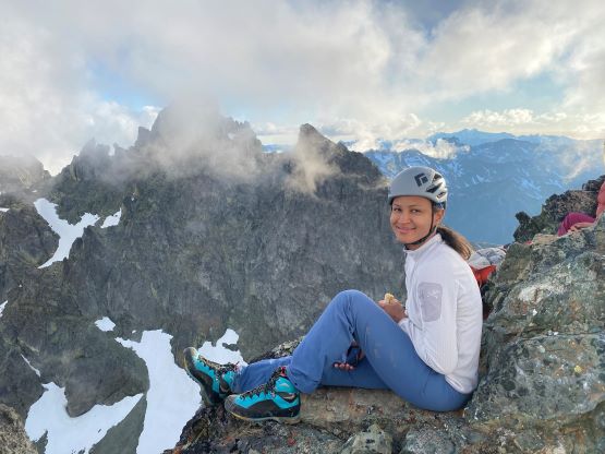 Mel popping out onto the SE Ridge after re-ascending the slabs