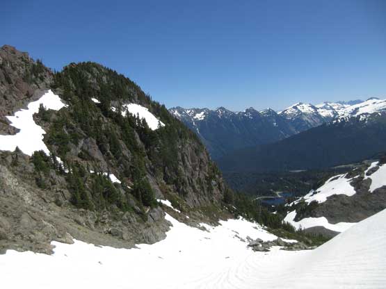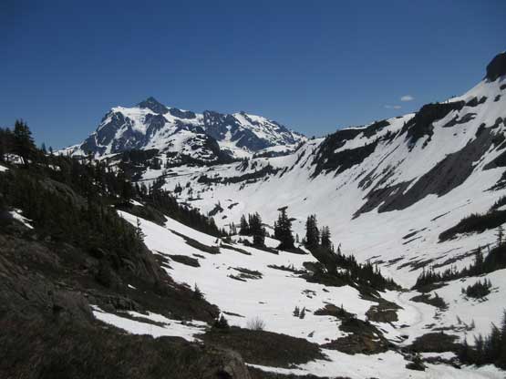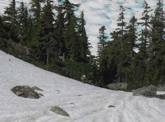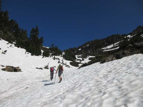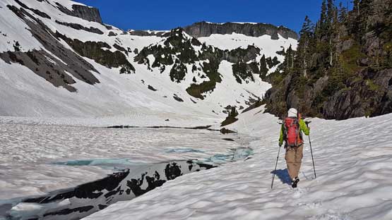 Vlad volunteered to drive and made good time up the Baker Highway sans a major accident delay on Highway 1 while getting out of Metro Vancouver. We didn’t opt for a super alpine start though so by the time we arrived at the trail-head the sun’s already beating down on full force. There’s snow right from the start so I had to wear mountaineering boots instead of the comfy trail-runners.. The ice axe and crampons were also packed and at this point we expected much of the ascent would be done on snow. Bagley Lake trail was 80% snow covered but popular enough that we had a well defined path to follow. Once passing that bridge connecting to Chain Lakes loop we were pretty much on our own. It’s difficult to follow the course of trails given the amount of snow coverage so at some point we opted to go straight up the valley aiming at the distant “Mazama col”.