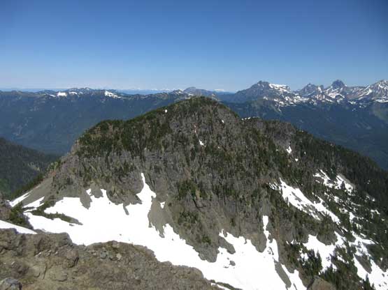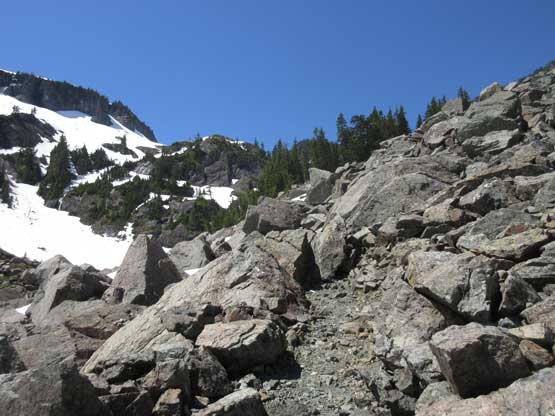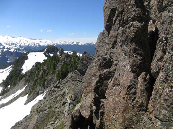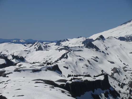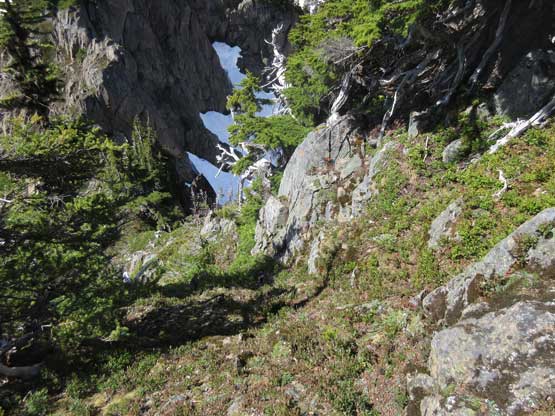 Al and Vlad had more ambitious plan to bag as many peaks as time allowed but I had to take extra care of myself. While watching Al and Vlad trudging up the east ridge of Mazama Dome I opted to sit that one out, slowly working my way into the “west gully” of Mt. Herman. Much of this section was traversing on snow and the shady aspect meant I had to don crampons. I only brought the aluminum crampons and they did the job perfectly. I never had to take the ice axe out because the slope’s not exposed and I liked the extra balance of the poles. The “west gully” was easy peasy and a lot less steep than I was expecting but the top 20 m was melted out revealing down-sloping and loose rocks. The transition involved a step-across over a scary moat and I also had to put weight on rocks while wearing aluminum crampons. Taking the ‘pons off was awkward but not unmanageable and after a bit of dirty 3rd class scrambling I soon reached the col on Mt. Herman’s south ridge. The south ridge itself appeared bone dry so I ditched the gears.