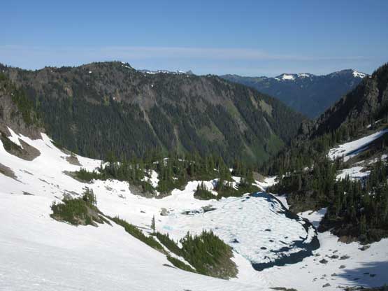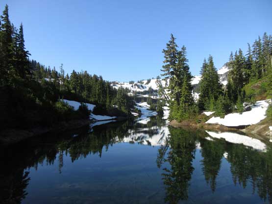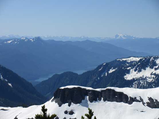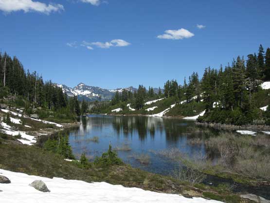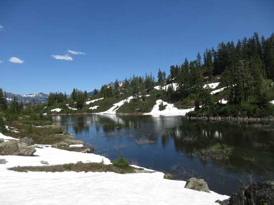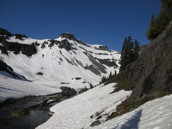 Vlad volunteered to drive and made good time up the Baker Highway sans a major accident delay on Highway 1 while getting out of Metro Vancouver. We didn’t opt for a super alpine start though so by the time we arrived at the trail-head the sun’s already beating down on full force. There’s snow right from the start so I had to wear mountaineering boots instead of the comfy trail-runners.. The ice axe and crampons were also packed and at this point we expected much of the ascent would be done on snow. Bagley Lake trail was 80% snow covered but popular enough that we had a well defined path to follow. Once passing that bridge connecting to Chain Lakes loop we were pretty much on our own. It’s difficult to follow the course of trails given the amount of snow coverage so at some point we opted to go straight up the valley aiming at the distant “Mazama col”.