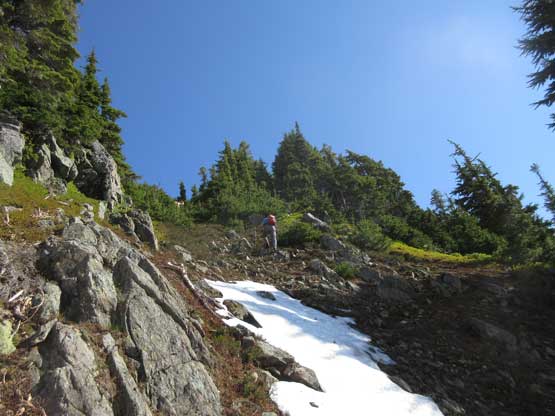 Al and Vlad had more ambitious plan to bag as many peaks as time allowed but I had to take extra care of myself. While watching Al and Vlad trudging up the east ridge of Mazama Dome I opted to sit that one out, slowly working my way into the “west gully” of Mt. Herman. Much of this section was traversing on snow and the shady aspect meant I had to don crampons. I only brought the aluminum crampons and they did the job perfectly. I never had to take the ice axe out because the slope’s not exposed and I liked the extra balance of the poles. The “west gully” was easy peasy and a lot less steep than I was expecting but the top 20 m was melted out revealing down-sloping and loose rocks. The transition involved a step-across over a scary moat and I also had to put weight on rocks while wearing aluminum crampons. Taking the ‘pons off was awkward but not unmanageable and after a bit of dirty 3rd class scrambling I soon reached the col on Mt. Herman’s south ridge. The south ridge itself appeared bone dry so I ditched the gears.