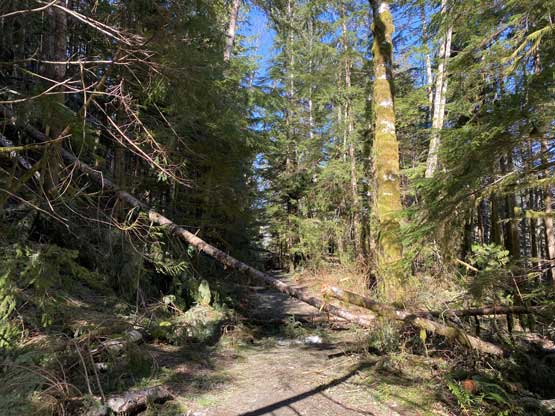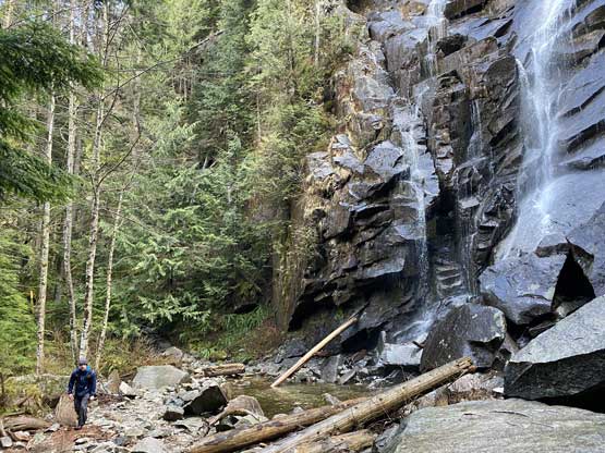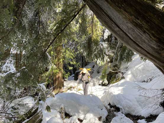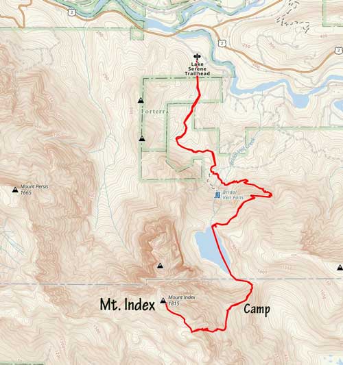 The approach to the camp on the lower east ridge would be “half a day” at most so we didn’t have to wake up early on Sunday. That’s good as I didn’t finish work until 9:30 pm on Saturday night and hadn’t bought food nor packed anything yet. I ended up not going to sleep until 1 am. The next morning I left White Rock at 9 am and the two of us departed Bellingham at 10 am. In less than two hours we had parked at Lake Serene trail-head and soon joined the hordes on the busy busy trail. The first portion of this trail was a gradual ascent following a deactivated logging road with a small detour due to a massive wash-out. A while later the trail made a turn towards east with some annoying up-and-downs past Bridal Veil Falls turn-off, followed by more annoying descents to the outlets of Bridal Veil Falls. Beyond that the trail started the steep ascents and switchbacks towards Lake Serene. There were a ton of wooded staircases suggesting a lot of trail-building effort, but the maintenance of this trail sucked big time as suggested by the dozens of dead-falls. To crawl under some of those dead-falls was super annoying with the overnight pack. The continuous snow didn’t start until the final major switchback and the snow soon became deep. Most hikers opted to don microspikes but such weren’t needed for us wearing full shank mountaineering boots. This was my first time using the Phantom 6000s for sea-level climbs and they started to give me blisters probably because we walked too fast. At the lake’s outflow we took a long break and I loosened the boots a little bit which seemed to help.