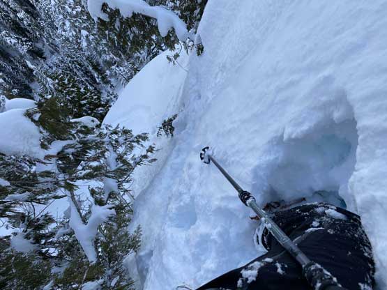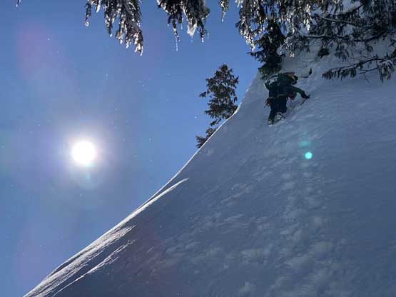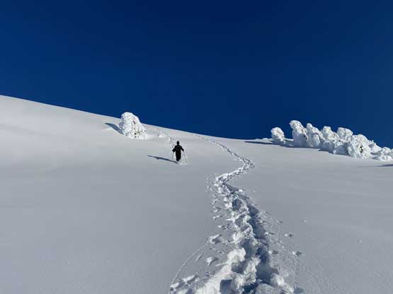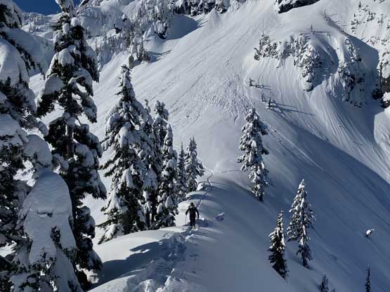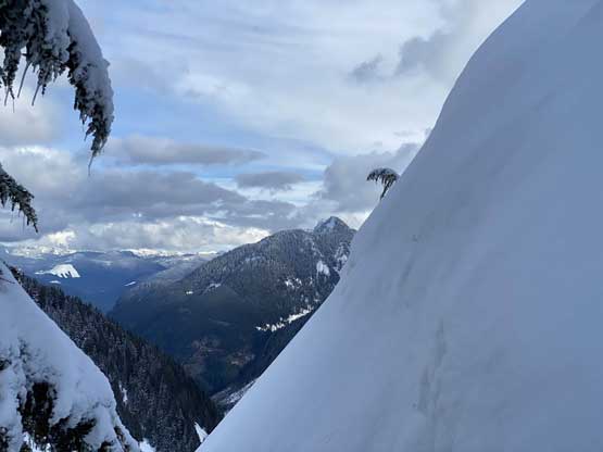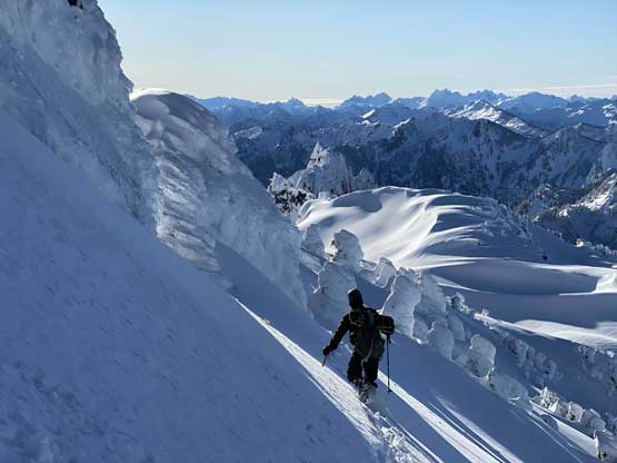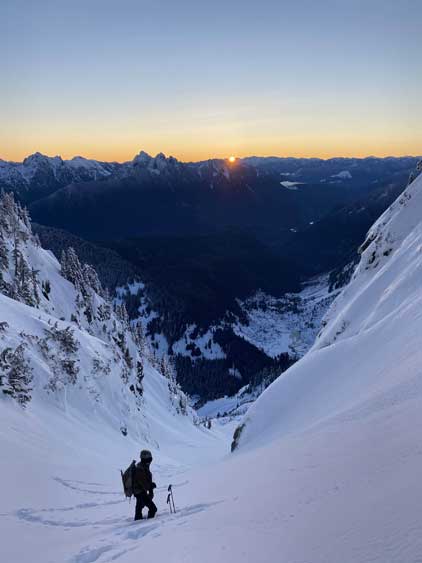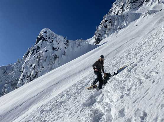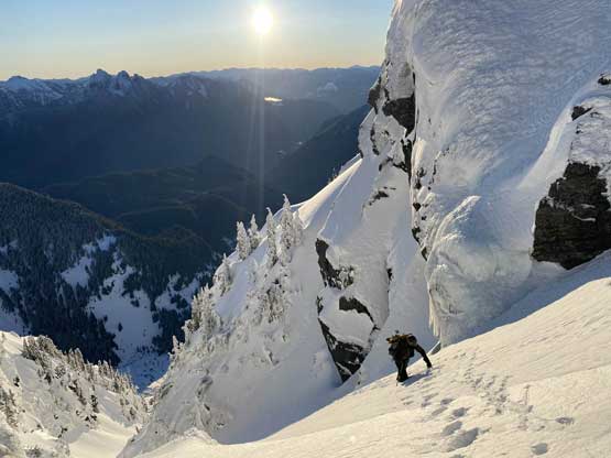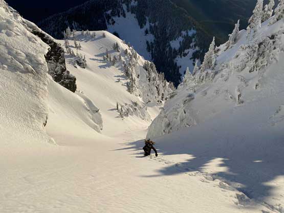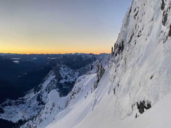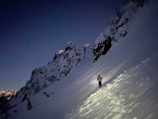 Monday would be the first day in a week that the east faces saw considerable amount of sunshine, so despite the cold temperature we agreed to climb most, if not the entire gully in the dark. At 5 am the alarm went off and an hour later we started the plod. The morning took us longer than expected because I couldn’t light up my stove using the sparker likely due to the coldness. Thankfully Connor brought a lighter that saved my breakfast… From camp we easily snowshoed over the narrow ridge with about 50 more meters of elevation gain to the base of Mt. Index’s east face, and then side-hill traversed into the entrance of Hourglass Gully. None of us liked this traversing zone as it’s exposed to a ton of overhead hazard, suggested by the abundance of sluff debris. The snow was soft enough that we could keep the snowshoes on. Into the lower gully we stuck on climber’s right side on the avalanche debris. The going became 40 degrees and we swapped snowshoes for crampons and ice axes and climbed the climber’s right variation into the “middle basin”. We had to strap the snowshoes back on as the grade in the basin was mellow (30-35 degrees) and loaded with fresh powder. Without snowshoes we would sink past our knees and even with snowshoes we started to sink past knee-deep as the going became steeper. The condition was very different than our prediction. This area hadn’t seen more than “a couple inches of snow” in the last storm cycle but apparently the face collected all of the wind drifts. Thankfully the new snow appeared to bond well and was not forming slabs. We had to keep the snowshoes on through the “hourglass” constraint, on 40 degree terrain and then continued making tight switchbacks into the upper basin. The going was slow but I had a ton of experience in wallowing knee+ deep powder on snowshoes, so kept charging on a steady pace. Once the grade became 45 degrees on the last 100 m to the ridge I started to hit the firm base layer and the snowshoes were then finally swapped for crampons and ice axes. The last 50 m climb out of the gully was actually pretty fun.