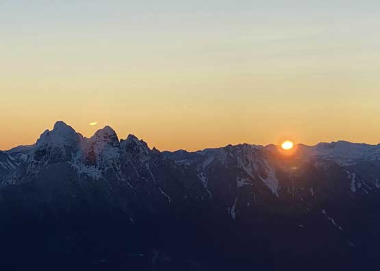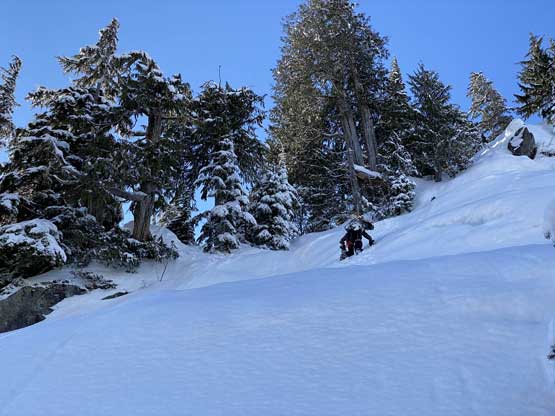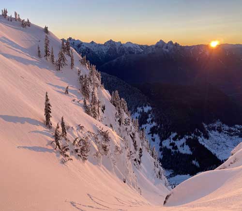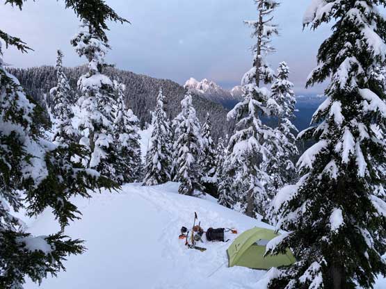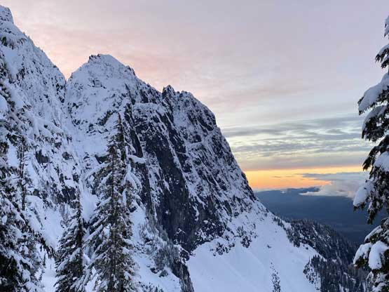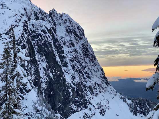 There were already pools of water at the lake’s outflow but we determined the lake was still safe to just walk across, so strapped the snowshoes on and onto the lake we went. There was no track beyond the shore so from this point onward we were on our own breaking trail. Plodding across the lake took no time and the grunt onto the lower east ridge saddle at Index/Philadelphia col was also easier than I thought, on mostly open slopes. From the col we took no break but immediately trudged up the lower east ridge, and five minutes later the snowshoes were swapped for crampons and ice axes. The grade steepened to 45 degrees in no time and the crust was icy. We climbed some easy 40-45 degree snow on the climber’s right side of the ridge crest on open terrain but the going soon became arduous when we were forced to go into the trees. The snow wasn’t as firm in the trees and we sank past knee deep many times. We also discovered a few waist deep spots that required some trenching techniques to get over. Connor took over the lead at the crux pitch. Haflway up towards the 60-degree section I started to realize the climbing was much harder than appeared from below, with shitty snow and considerable exposure. It’s too late and awkward to do any unnecessary transition so we just had to suck it up and get over with it. Above the crux step there was still considerable amount of easier-grade snow climbing before the terrain flattened out. We then strapped snowshoes back on and found a neat spot to set up camp. The ascent to camp took us 4.5 hours. We spent the rest of the evening doing the usual winter camping routine, checking forecasts (there’s data coverage) as well as taking photos for the gorgeous sunset.