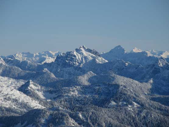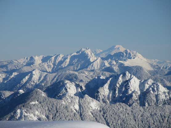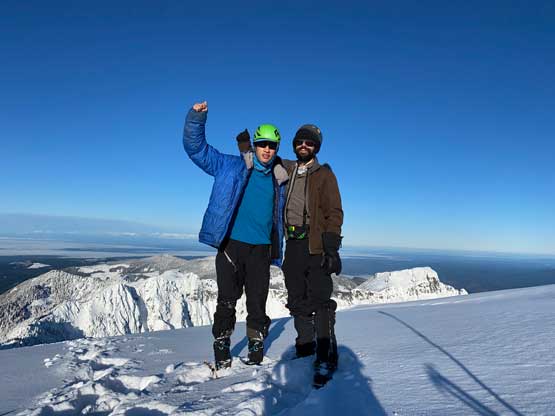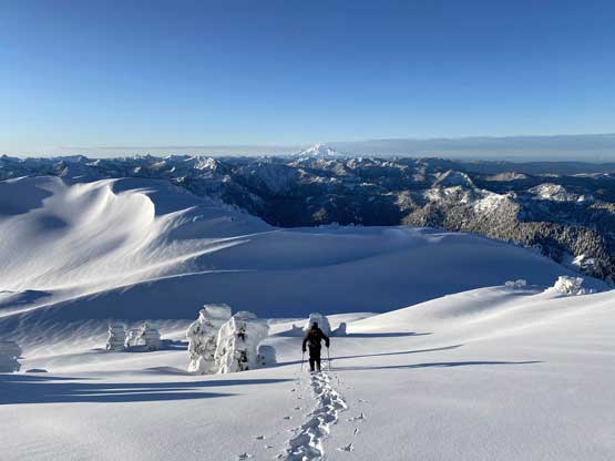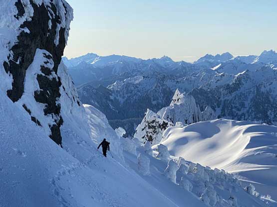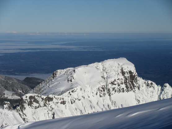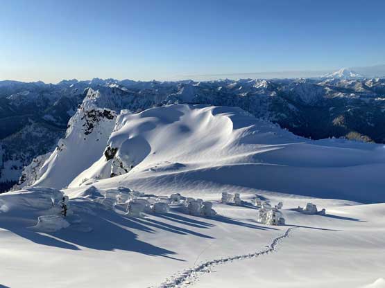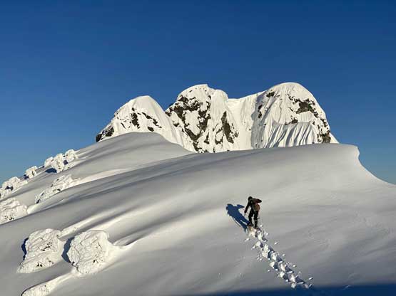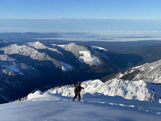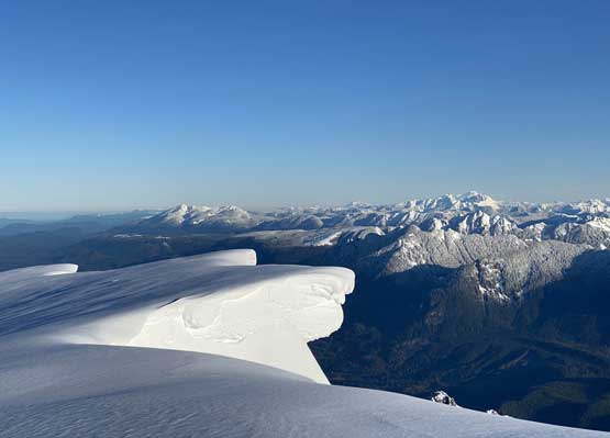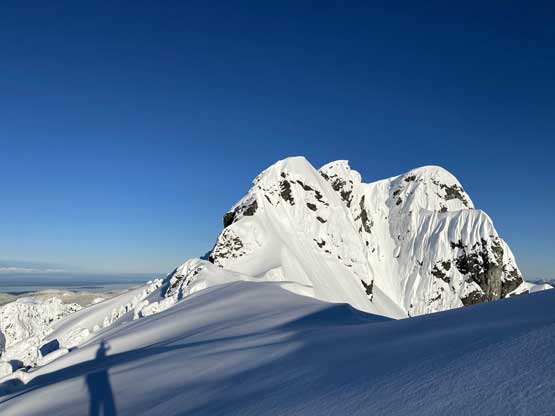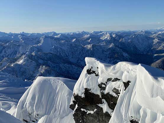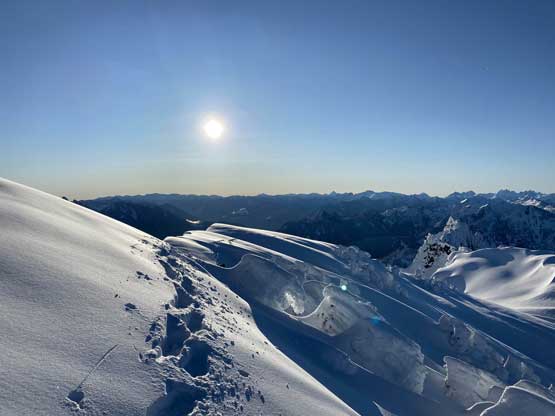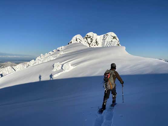 The crampons were swapped for snowshoes once we started the traverse and ascent onto the broad summit ridge. The going was pretty easy and the views were ass-kicking. After a few mellow rolls the ridge narrowed down and we had to be careful about cornices. The summit block loomed impressively ahead and based on Lemke’s trip report we knew the attack was on the left (west) side. At the base I ditched snowshoes for crampons and ice axe (yes, one more transition) and easily led across the 40-degree traverse into the SW Face. The traverse was then followed by some 35-degree ascent on firm snow and 10 minutes later we were on the summit, soaking in incredible views towards all directions. However, it’s 8:45 am and we were already behind schedule so our summit stay was short.