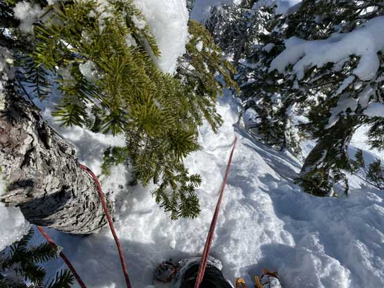 Reversing the summit block was easy and instead of swapping gears for two times we opted to keep the crampons on the summit ridge. The base layer under the new snow was actually firm enough to hold our weight so there wasn’t much additional post-holing needed. We carefully down-climbed the upper 50 m into the gully and then started plunging. We soon abandoned the plunging techniques in trade for glissading. Needless to say, it was a super duper fun descent down into and out of the hourglass on our asses. In no time we were at the bottom of the gully strapping snowshoes back on. The traverse back to the east ridge and then down to our camp was without incidence. We spent as little time as possible to break camp. It appeared that we should definitely be back home by dinner time so I sent some work texts to let them know that I did not have to cancel the evening hours’ work. The descent to the 60-degree crux pitch was easy but required caution. For the crux we opted for a single rappel using my 30 m rope. The rope didn’t quite reach the bottom of the steepness but at that point we were both fine to just down-climb.