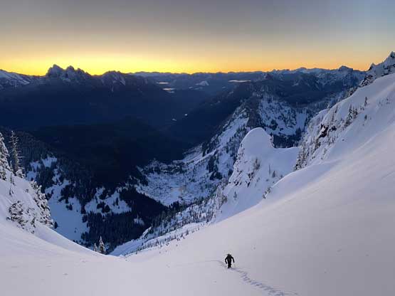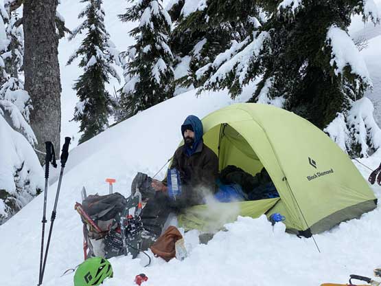There were already pools of water at the lake’s outflow but we determined the lake was still safe to just walk across, so strapped the snowshoes on and onto the lake we went. There was no track beyond the shore so from this point onward we were on our own breaking trail. Plodding across the lake took no time and the grunt onto the lower east ridge saddle at Index/Philadelphia col was also easier than I thought, on mostly open slopes. From the col we took no break but immediately trudged up the lower east ridge, and five minutes later the snowshoes were swapped for crampons and ice axes. The grade steepened to 45 degrees in no time and the crust was icy. We climbed some easy 40-45 degree snow on the climber’s right side of the ridge crest on open terrain but the going soon became arduous when we were forced to go into the trees. The snow wasn’t as firm in the trees and we sank past knee deep many times. We also discovered a few waist deep spots that required some trenching techniques to get over. Connor took over the lead at the crux pitch. Haflway up towards the 60-degree section I started to realize the climbing was much harder than appeared from below, with shitty snow and considerable exposure. It’s too late and awkward to do any unnecessary transition so we just had to suck it up and get over with it. Above the crux step there was still considerable amount of easier-grade snow climbing before the terrain flattened out. We then strapped snowshoes back on and found a neat spot to set up camp. The ascent to camp took us 4.5 hours. We spent the rest of the evening doing the usual winter camping routine, checking forecasts (there’s data coverage) as well as taking photos for the gorgeous sunset.