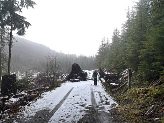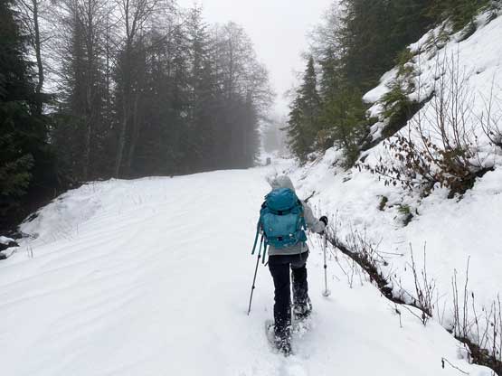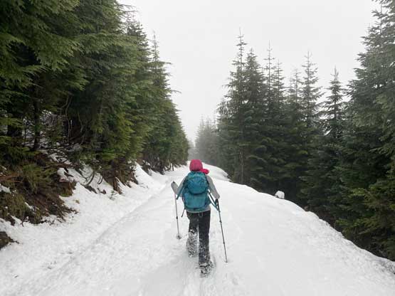 After taking an obligatory summit shot we immediately started the descent. We were both cold and wet that we just wanted to get back to the truck, as soon as possible. We only did one transition on the return hike to undo snowshoes. The weather actually improved slightly as it stopped raining, but still 100% overcast. The sun never showed up on this day. We arrived back at the truck at 10:30 am. Due to the wetness I decided to just call it a day here but once getting back to Bellingham and knowing the rain had fully stopped I asked Masayo if she’s keen to bag a few more dumpsters, and she said yes…