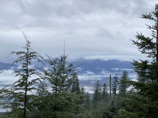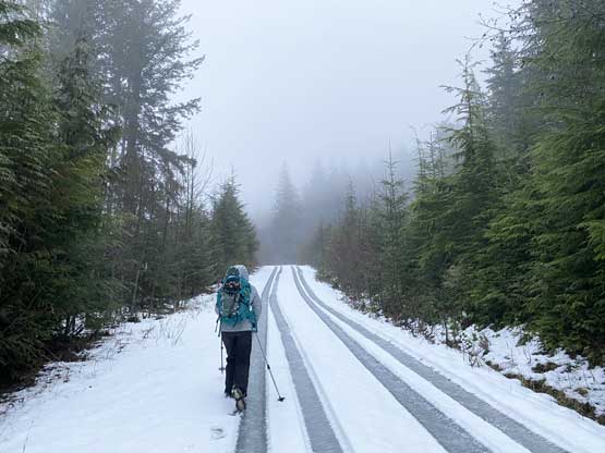 Masayo and I made a last-minute decision to explore the logging roads on the southern flanks of Mt. Josephine due to the change of weather forecast. We had some other plans further down south but with clouds and rain in the forecast we didn’t want to drive too far away. There are lots of dumpster-diving options near Bellingham. I randomly picked Mt. Josephine because it triggered my curiosity. There had been ascents in 2019 according to peakbagger.com but well-written trip reports were lacking. There’s a maze of logging roads to choose from and my decision was to follow the link-up as documented on the SummitPost page. In order to avoid border traffic I drove south out of White Rock at 5:30 am and crossed into US with only a couple minutes delay. When we arrived at the start of the logging road it was still dark, and had started to rain. We drove up nonetheless. The road condition was much better than expected. The grade was steep at a few spots but the road bed was very smooth, that I’m sure a 2WD could handle it. I did not expect being able to drive very far up the road but we ended up driving past the upper gate. I parked once encountering snow and at this point, the summit was only 400 vertical meters higher and a few kilometers away.