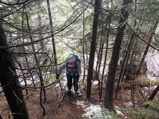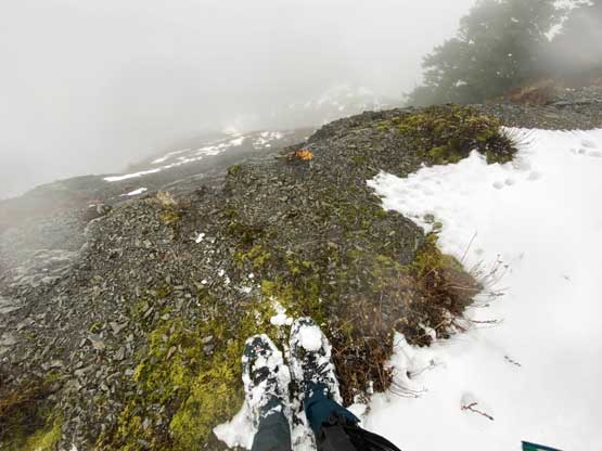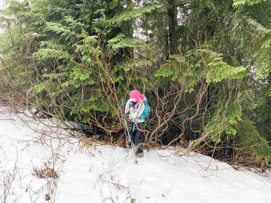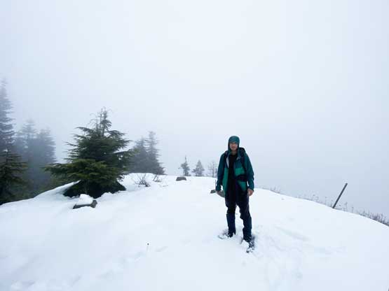 In retrospect I could have driven a little farther up but there’s no such point. We soon hit a driveable end thank to a huge washout. Tire tracks reappeared from the other side and we soon realized that the peak could be driven up from more than one starting points. We soon bypassed the western sub-summit on its south/east sides and were now traversing towards the saddle immediately to the west of the main summit. We encountered a few more branches of logging roads but with a GPS device there’s no confusion. After making a right turn at the saddle all tire tracks had stopped. At about 200 m below the summit we stopped to strap snowshoes on. We thought they weren’t needed based on earlier observations but in the end, we still needed the ‘shoes. The snow depth increased drastically as we slowly but steadily gaining elevation towards the summit. I made one navigation error by convincing Masayo that we had to bushwhack up the final 50 m elevation. The brushes were terrible and thank to the rain we were drenched in no time. To our great surprise we soon broke out of the timbers onto a narrow and overgrown road that appeared to keep going upwards. This uppermost spur was not shown on my GPS maps but I can only blame myself for not researching enough. We gladly accepted the surprise and easily snowshowed to the highest point, with no view of course.