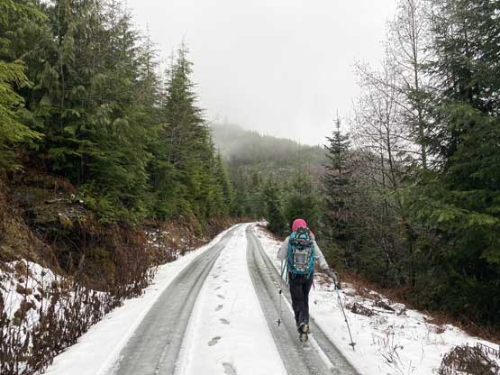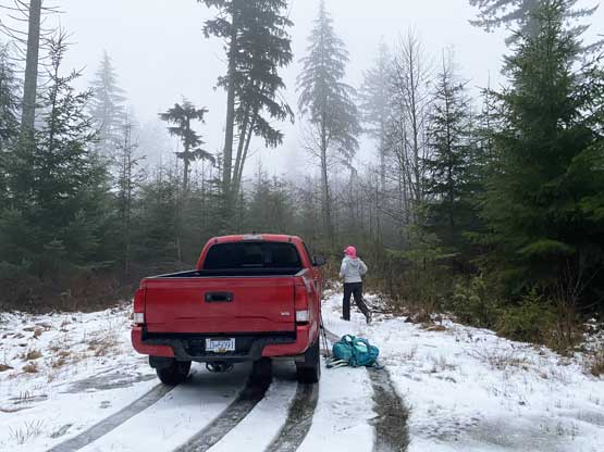 After taking an obligatory summit shot we immediately started the descent. We were both cold and wet that we just wanted to get back to the truck, as soon as possible. We only did one transition on the return hike to undo snowshoes. The weather actually improved slightly as it stopped raining, but still 100% overcast. The sun never showed up on this day. We arrived back at the truck at 10:30 am. Due to the wetness I decided to just call it a day here but once getting back to Bellingham and knowing the rain had fully stopped I asked Masayo if she’s keen to bag a few more dumpsters, and she said yes…
