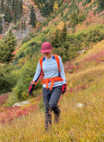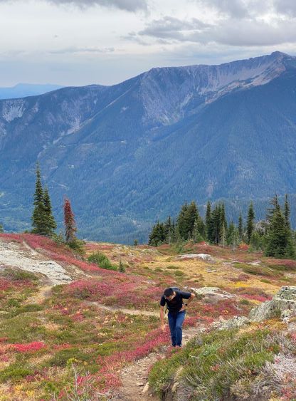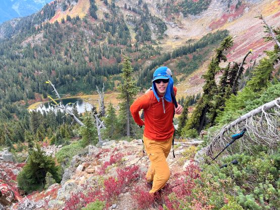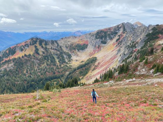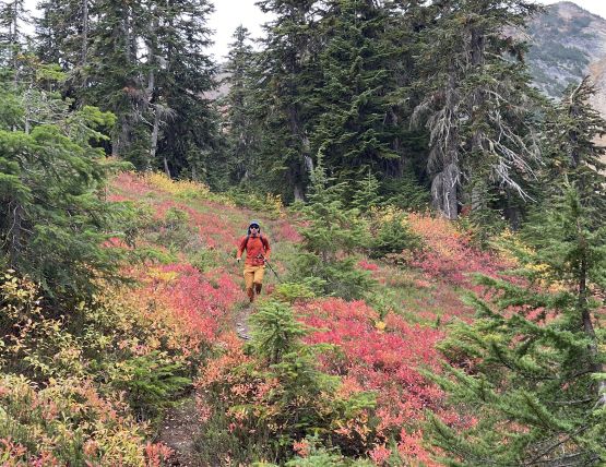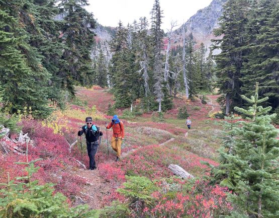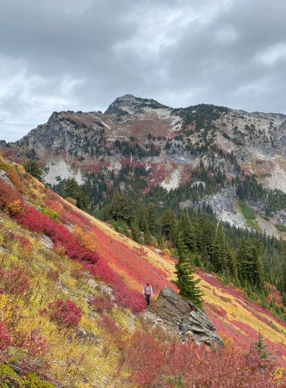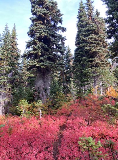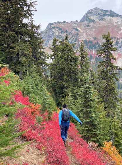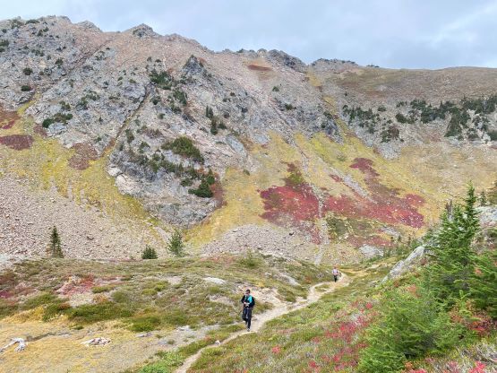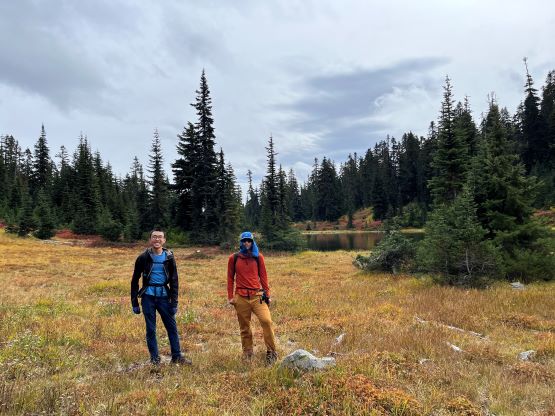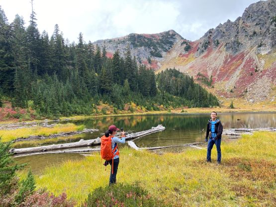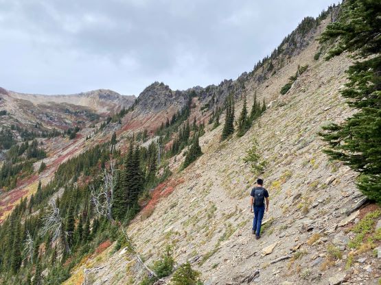 In any case the four of us gathered in White Rock at 3:30 am and I drove us a few hours south and then eastwards. The weather was more promising in the morning so I made the call to start early to take advantage of that. I was not anticipating a lot of views to be honest, but this trip turned out to be quite scenic with lots of fall colours. The drive was a little bit slower than I thought because we needed to stop a few times for gas and breakfast. The unpaved road to Merritt Lake trail-head was also rough. It was definitely the correct call to bring the Tacoma all the way down there even just for the final few kilometers. I don’t think we could otherwise drive to the trail-head in Kostya’s Tesla.