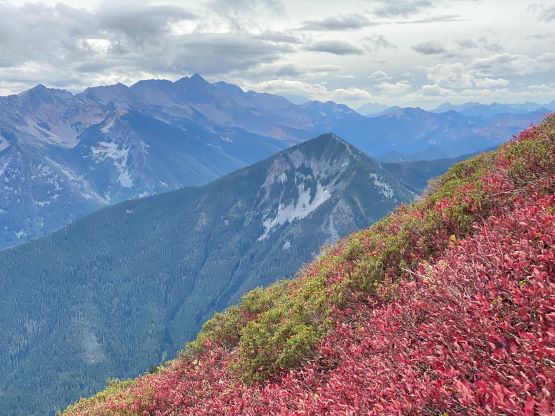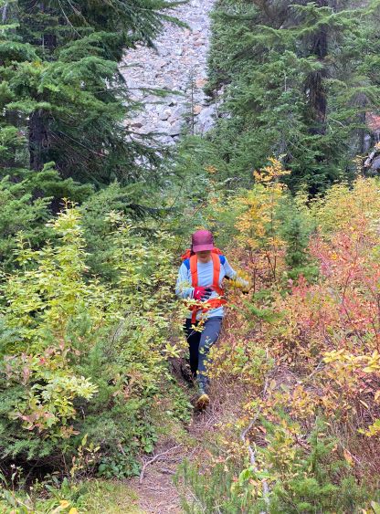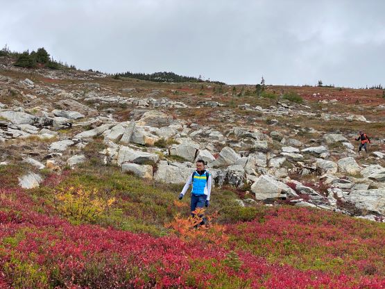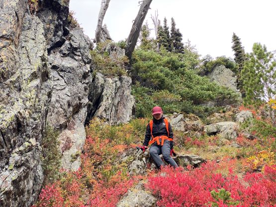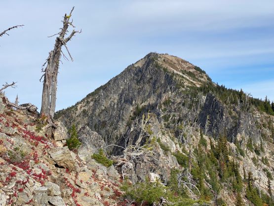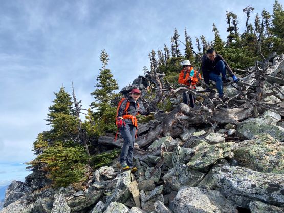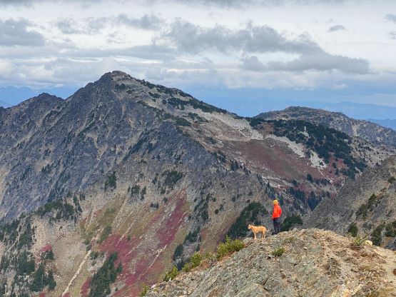 The final decision was made to include Rock Mountain but having only one vehicle we must do an out-and-back kind of dash from this spot. The trail was again, more overgrown than anticipated, but thankfully the leaves were mostly dry by this point. There were also some annoying up-and-downs that I had never thought about. I knew we’d be dealing with up-and-downs on the way back to the parking lot, but I wasn’t expecting undulating terrain en route to Rock Mountain. This was shaping up to become a big day, but we had made the decision so we must carry on. I had previously thought about to do Rock Mountain in winter on snowshoes, but there’s one worrisome slope and I could confirm that slope is indeed in avalanche terrain. Nonetheless Kostya and I went ahead and set a blistering pace and in short time we all arrived at the summit. To our surprise we encountered two solo hikers and one dog.