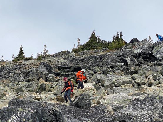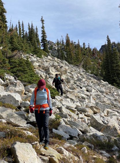 Kostya and Rex leading up the lower traverse towards Rock Mountain