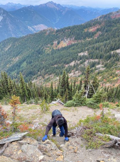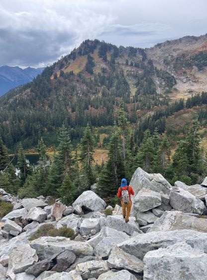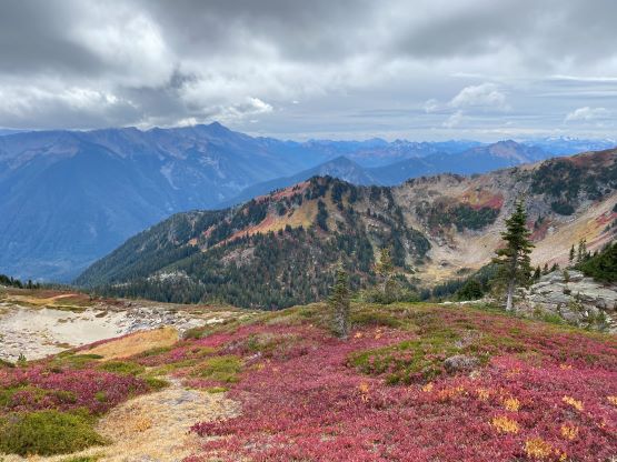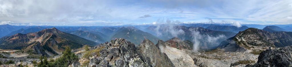 After almost an hour socializing on the summit we decided to descend. We were doing great on time, but the weather was closing in and there was rain in the forecast in the afternoon. Indeed, the rain started after we dashed back to that lake and lasted for the rest of the day. I mostly followed Kostya trail running most, if not all of the downhills. That 200-m uphill in the middle of the descent was surely annoying, but provided some variety and relieve to our knees. We eventually finished the round trip in under 10 hours, but over 3 hours were “stopping time” meaning we took some lengthy breaks here and there. The rain had thoroughly soaked the vegetation so we were all soaked to the bone, but thankfully we brought changing cloths in the vehicle. Kostya and I took turn driving us back to Everett area for a much-needed dinner, before resuming the long drive homewards.