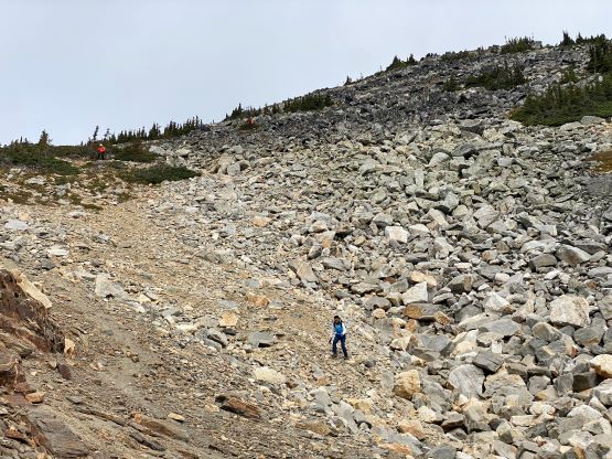The summit of Mt. Mastiff was the least interesting among the three so we didn’t linger too long up there. The easiest way to connect this peak towards Mt. Howard was to descend the south-west slopes but we decided to stay closer to the connecting ridge. We encountered some boulder fields and thrashy areas but otherwise the scrambling was still straightforward. Lower down near Mastiff/Howard col I led us descending a boulder field veering off the ridge crest, and brought us to the easy NE slopes of Mt. Howard. The ascent of Mt. Howard from here was tedious but straightforward. There was nothing worth noting except for perseverance. The summit was cold and windy, so again we only stayed for about half an hour up there.