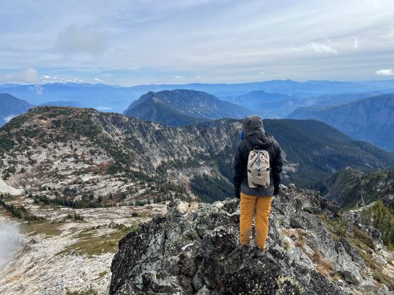 There’s considerable amount of elevation gain to reach the first junction of the trail where the smaller trail branches off to the left onto “Nason Ridge”. The main trail continues rightwards towards Merritt Lake and judging by the reference GPX track I’m sure many people made a mistake here. We paid attention to the GPS so correctly located this turn-off. The trail beyond this turn-off was slightly overgrown. There wasn’t any “thrashing” but the leaves were extremely wet from the recent precipitation, that we all got somewhat soaked. The next junction was on the ridge crest where we must pick up the unsigned and unofficial path heading upwards towards Mt. Mastiff. This path would be difficult to locate without the GPS device and even with the GPX track it was not obvious. We ended up doing some unnecessary bushwhacking before finding that trail. This unofficial trail brought us up along the broad and forested ridge and the ridge was quite long and undulating. One section in the middle required scrambling and detouring to the north side. The scrambling was “class 2” at most if one’s willing to stay on the easiest path, but we all did some harder moves for fun. The rest of the ascent to Mt. Mastiff was a slog and not particularly enjoyable.
