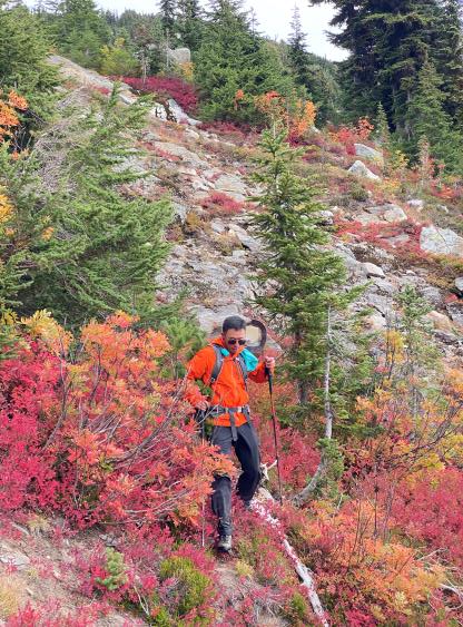 The final decision was made to include Rock Mountain but having only one vehicle we must do an out-and-back kind of dash from this spot. The trail was again, more overgrown than anticipated, but thankfully the leaves were mostly dry by this point. There were also some annoying up-and-downs that I had never thought about. I knew we’d be dealing with up-and-downs on the way back to the parking lot, but I wasn’t expecting undulating terrain en route to Rock Mountain. This was shaping up to become a big day, but we had made the decision so we must carry on. I had previously thought about to do Rock Mountain in winter on snowshoes, but there’s one worrisome slope and I could confirm that slope is indeed in avalanche terrain. Nonetheless Kostya and I went ahead and set a blistering pace and in short time we all arrived at the summit. To our surprise we encountered two solo hikers and one dog.