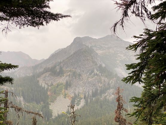 After almost an hour socializing on the summit we decided to descend. We were doing great on time, but the weather was closing in and there was rain in the forecast in the afternoon. Indeed, the rain started after we dashed back to that lake and lasted for the rest of the day. I mostly followed Kostya trail running most, if not all of the downhills. That 200-m uphill in the middle of the descent was surely annoying, but provided some variety and relieve to our knees. We eventually finished the round trip in under 10 hours, but over 3 hours were “stopping time” meaning we took some lengthy breaks here and there. The rain had thoroughly soaked the vegetation so we were all soaked to the bone, but thankfully we brought changing cloths in the vehicle. Kostya and I took turn driving us back to Everett area for a much-needed dinner, before resuming the long drive homewards.