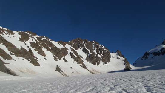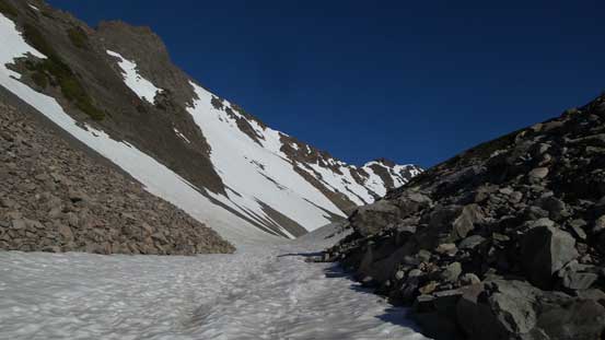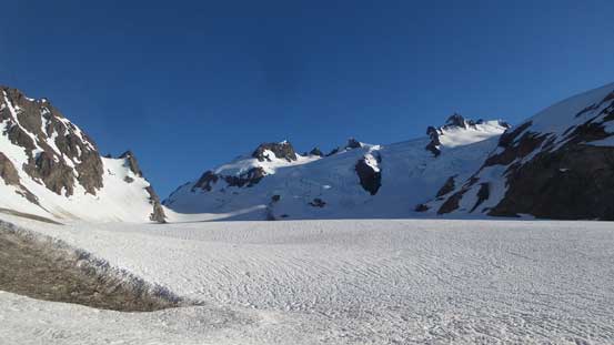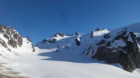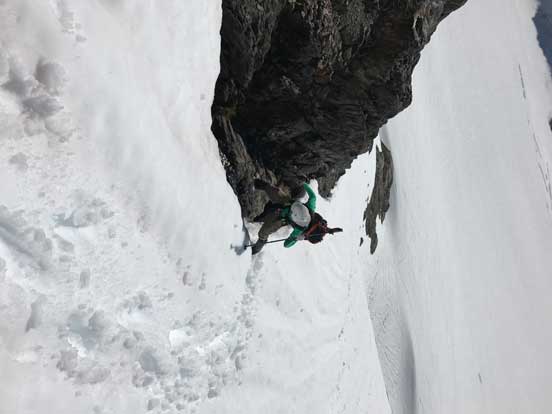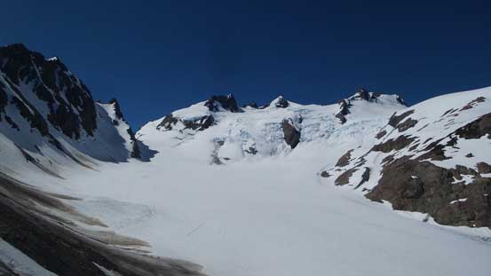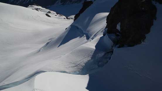 Huge bergschrund blocking the exit of “4th-of-July” route.