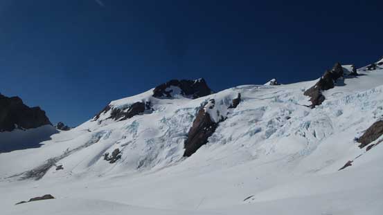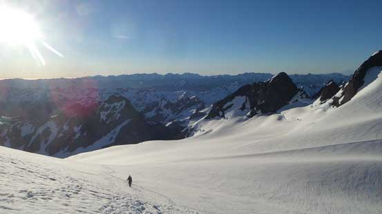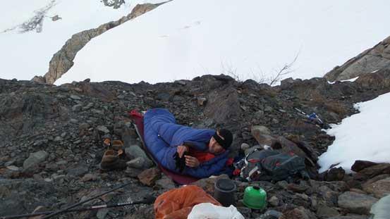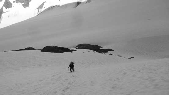 We certainly did not have much extra time to kill so down the moraine we went. Initially it looked like we could traverse higher and then descend entirely on snow but upon close examination the scree wasn’t bad at all. I have to comment that I’ve ascended more than 400 peaks in the chossy Canadian Rockies so being able to negotiate this type of loose terrain is pretty much a pre-requisite. It took us no time to surf down the scree and then we merged onto snow which was soft enough to just plunge/post-hole down on our heels. Now onto the lower Blue Glacier flats we picked up a set of (faint, melted out) tracks and had no problem keeping a general bearing towards the icefalls. The plod across this lower glacier was longer than we thought and by the time we reached the other side we abandoned the idea of pushing all the way to Snow Dome. There appeared to have plenty of rock platforms about 1/3-1/2 way up towards Snow Dome and we’d set up the bivy upon reaching a “reasonable” site. There were moderate post-holing involved once getting off the glacier but thankfully it didn’t take us long to find a good bivy site.