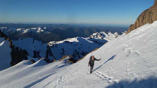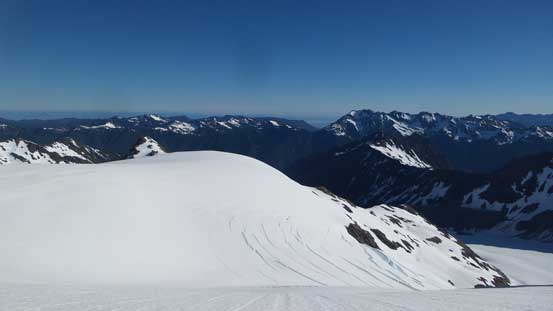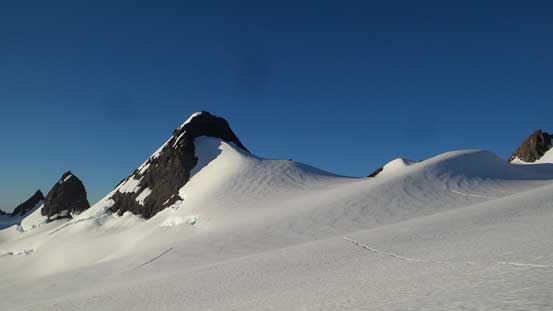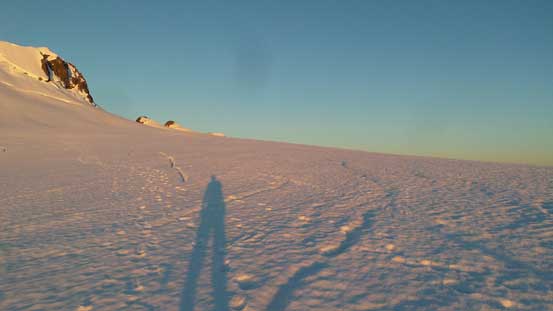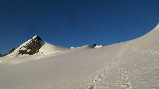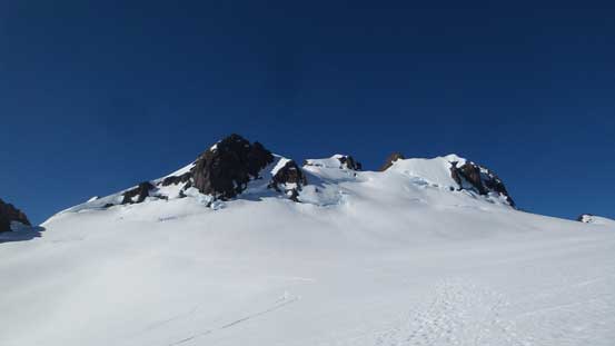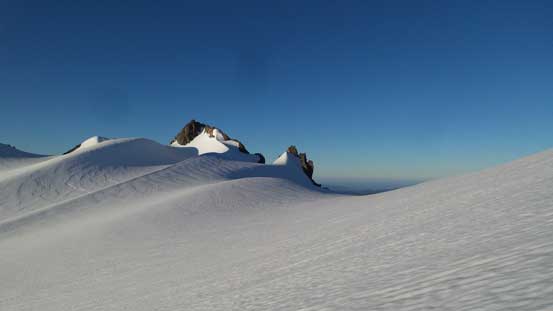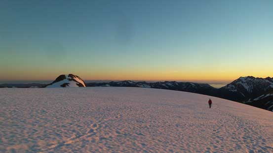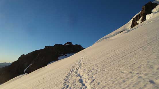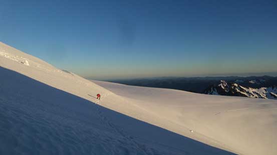 Traversing across the upper Blue Glacier was a simple fair of putting one foot in front of another. A couple crevasses were opening up but the previous parties had done a great job route-finding and combining with the firm snow there’s literally nothing to worry about. The routes split ahead but since there’s no track heading up the direct, “4th-of-July” route we’d follow the hordes working around towards Crystal Pass. In no time we were at Crystal Pass and then a steep step later we were on the south side of “Five Fingers Ridge” traversing towards the distant false summit. This stage also had a few big crevasses but the condition was still “early season” meaning the route took a more-or-less direct line. Another mandatory break was spent on the false summit to eat and food and study the last stretch.