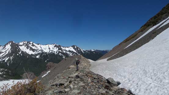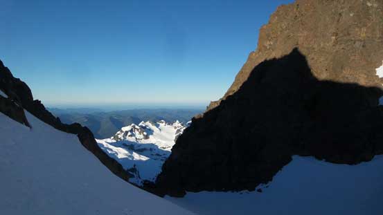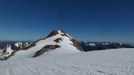 Easy going to get off from the false summit and then up and over Crystal Pass. The snow was still mostly firm although it’s certainly softening up thank to the merciless sun. Vlad pointed out that it’s probably only a half-an-hour detour to check off “Panic Peak”. I wasn’t super keen more because of the long day ahead but since we were there anyway we had to give it a go. It turned out to be a good side detour with some rare views looking down into Glacier Creek drainage and Mt. Tom. I still couldn’t figure out how to access that cool-looking mountain.
