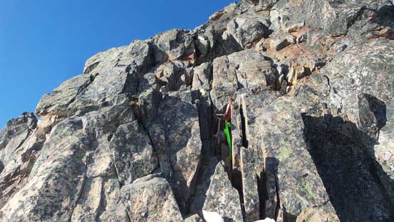 Descending into the saddle between false and true summits was still mostly on snow, and then up the opposite side we simply used the previous parties’ tracks. The steps were perfect and we got up this 45-degree slope with literally not much effort, and then we were staring at the final pitch. The early-season conditions meant we’d have no problem crossing the moat and the depth of the snowpack might also shaved a couple moves off for us. We managed to reach the belay station while staying entirely on snow. There had a good platform to swap gears and seeing the pitch ahead I decided to not use rock shoes. It turned out to be much easier than described with only a couple “4th class” moves and that’s about it. I put in two pieces of pros in anyway since we had brought them up that far, and then belayed Vlad up. The traverse to the true apex was easy going but the register booklet was completely soaked.