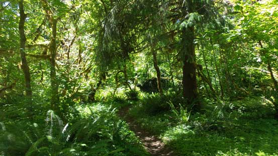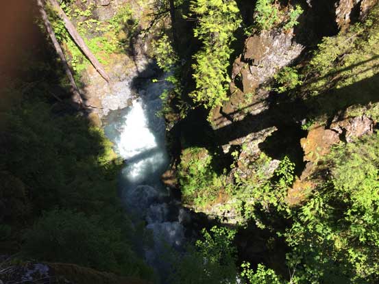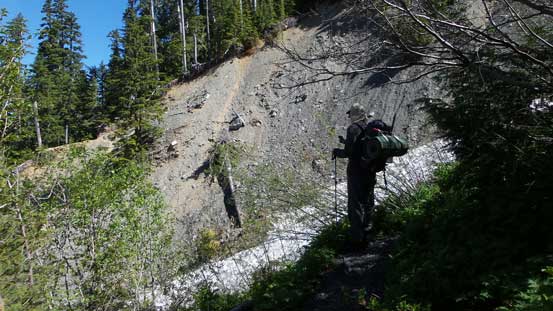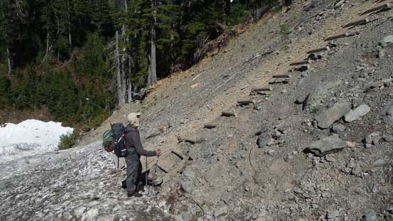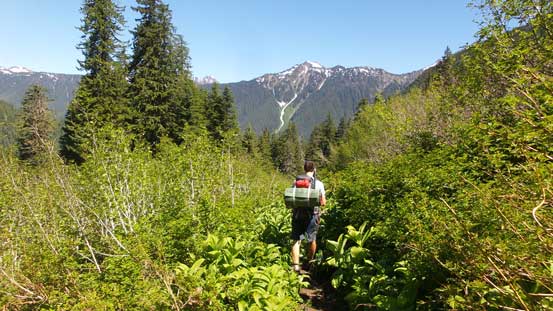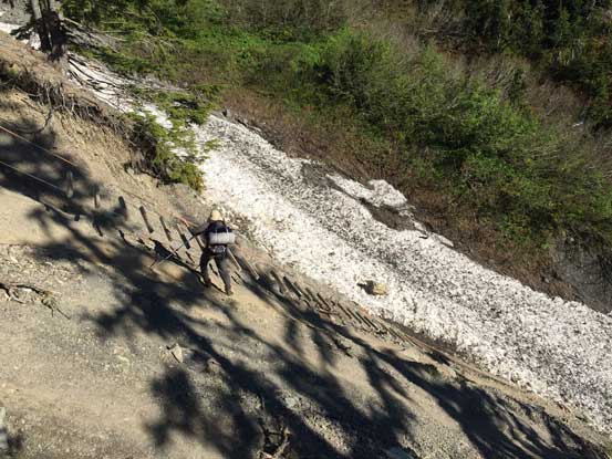Towards the end of this long flat stretch we could see the Hoh River narrowing down into a canyon feature while the trail ascends steeply up the left side bank before dropping down to cross the river. It’s here that the tiredness finally started to creeping in more likely due to the monotonous plod. Vlad finally decided to switch the sneakers to his backpacking boots while the Sportiva Nepal Evos still stayed in my pack. The bridge at mile-13 was impressive traversing 140 vertical feet above the canyon. After this bit of excitement we finally started to gain elevation. The first half this bulk of gain goes to Elk Lake and then the final 2 miles to Glacier Meadows has some rough sections including some steep traverses and that infamous ladder. While everyone seems to like using the ladder I decided to just scree-surfing down the skier’s right side which worked much better. I finally decided to ditch runners and don mountaineering boots at this stage and then we took another half-an-hour break so that I could cook my Mountain House dinner (Rice & Chicken).