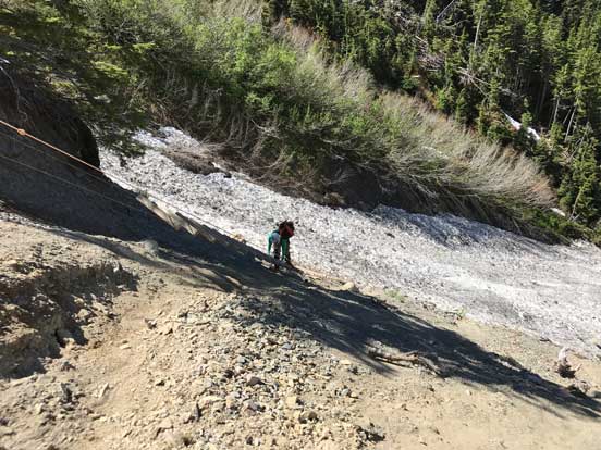 Now with the sun really beating down the plunge down from Snow Dome was fast and fun. In no time we got back to the bivy site. Another half an hour was spent packing up and then down onto the lower Blue Glacier. There were some post-holing but nothing terrible. The steep ascent back onto the moraine was tiring but then the plunge down into Glacier Meadows was again, fast and fun. Picking up my ditched runners I decided to wear the mountaineering boots until the grade flattens out down by Hoh River more to save my ankles.