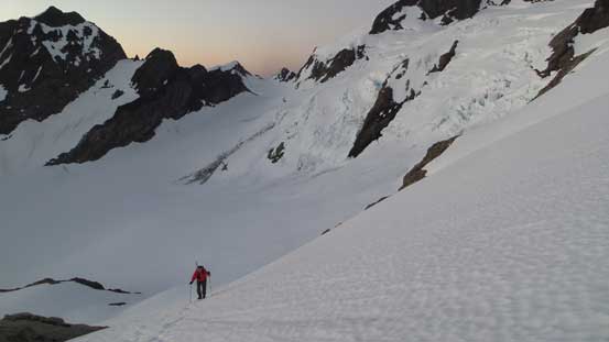 We certainly did not have much extra time to kill so down the moraine we went. Initially it looked like we could traverse higher and then descend entirely on snow but upon close examination the scree wasn’t bad at all. I have to comment that I’ve ascended more than 400 peaks in the chossy Canadian Rockies so being able to negotiate this type of loose terrain is pretty much a pre-requisite. It took us no time to surf down the scree and then we merged onto snow which was soft enough to just plunge/post-hole down on our heels. Now onto the lower Blue Glacier flats we picked up a set of (faint, melted out) tracks and had no problem keeping a general bearing towards the icefalls. The plod across this lower glacier was longer than we thought and by the time we reached the other side we abandoned the idea of pushing all the way to Snow Dome. There appeared to have plenty of rock platforms about 1/3-1/2 way up towards Snow Dome and we’d set up the bivy upon reaching a “reasonable” site. There were moderate post-holing involved once getting off the glacier but thankfully it didn’t take us long to find a good bivy site.
