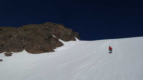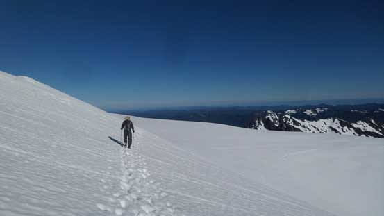Traversing across the upper Blue Glacier was a simple fair of putting one foot in front of another. A couple crevasses were opening up but the previous parties had done a great job route-finding and combining with the firm snow there’s literally nothing to worry about. The routes split ahead but since there’s no track heading up the direct, “4th-of-July” route we’d follow the hordes working around towards Crystal Pass. In no time we were at Crystal Pass and then a steep step later we were on the south side of “Five Fingers Ridge” traversing towards the distant false summit. This stage also had a few big crevasses but the condition was still “early season” meaning the route took a more-or-less direct line. Another mandatory break was spent on the false summit to eat and food and study the last stretch.