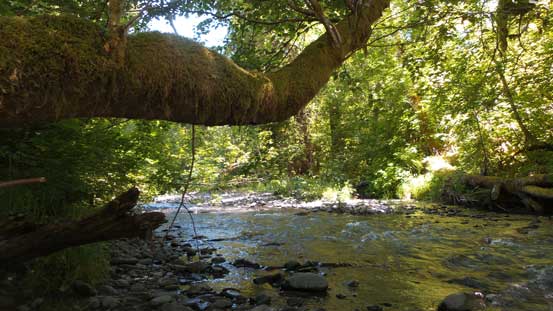 Towards the end of this long flat stretch we could see the Hoh River narrowing down into a canyon feature while the trail ascends steeply up the left side bank before dropping down to cross the river. It’s here that the tiredness finally started to creeping in more likely due to the monotonous plod. Vlad finally decided to switch the sneakers to his backpacking boots while the Sportiva Nepal Evos still stayed in my pack. The bridge at mile-13 was impressive traversing 140 vertical feet above the canyon. After this bit of excitement we finally started to gain elevation. The first half this bulk of gain goes to Elk Lake and then the final 2 miles to Glacier Meadows has some rough sections including some steep traverses and that infamous ladder. While everyone seems to like using the ladder I decided to just scree-surfing down the skier’s right side which worked much better. I finally decided to ditch runners and don mountaineering boots at this stage and then we took another half-an-hour break so that I could cook my Mountain House dinner (Rice & Chicken).