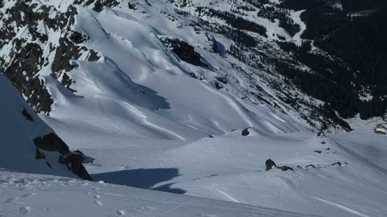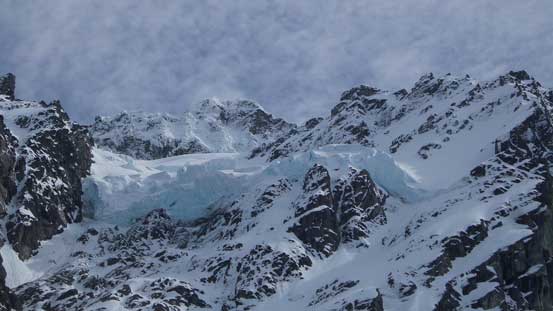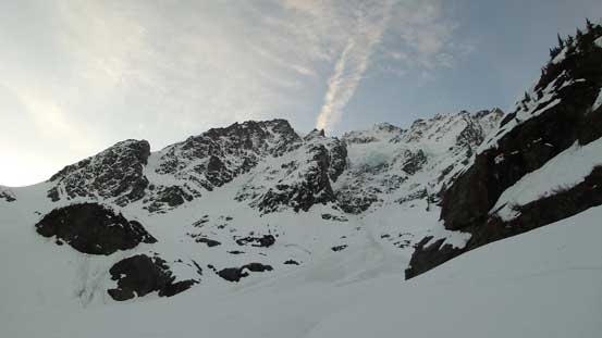 Over a long section of steep side-hilling (yes, on snowshoes which sucked), two or three troublesome creeks and then a long down-hill traverse on the edge of a huge slide path (while losing more than 250 m elevation) I eventually got myself down into the bottom of that White Salmon Creek. The slide path (already slid with impressive debris all over the place) had yet to be crossed and after that I finally picked up some faint set of skin tracks and from there on I knew it’s going to be a long plod (more than 1000 vertical meters) firstly to the head of the drainage and then up White Salmon Glacier. The freeze was still poor here in such way that as long as I was not on the skin tracks I would break the crust, sink and then slip backwards. The skin tracks would suck for snowshoe travel for simple reason that they were aiming to traverse back-and-forth instead of shooting straight-up, but still, that beat post-holing.