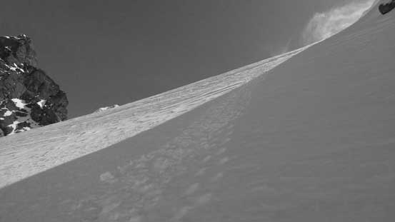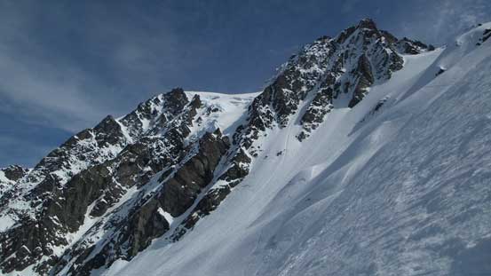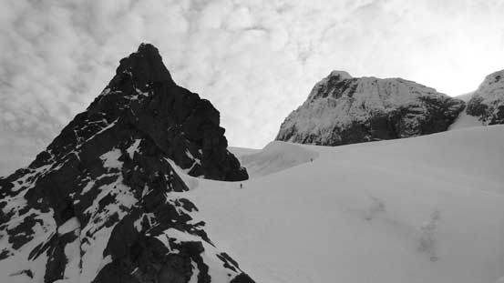 The White Salmon Glacier was long (as mentioned before) and steep with lots of micro-terrain involved. The skin tracks had eliminated most, if not all of my route-finding which I greatly appreciated. A few steep side-hill traverses, a few rolls and then a few open crevasses (easily avoided on their tracks) later I could see my altimeter reading approaching 2000 m and the next thing I had crested the ridge top on Shuksan Arm. Following the broad ridge upwards and then boot-packing up Winnie’s Slide (45 degrees snow climbing, and again, thank to the tracks from previous parties) I was surprised to see two tents on the saddle and two skiers boot-packing down the upper mountain.