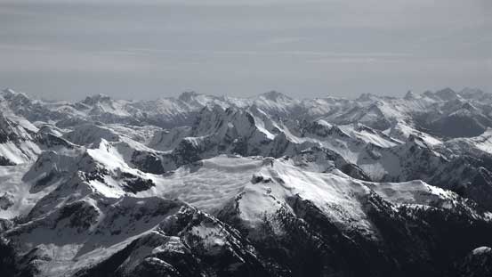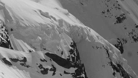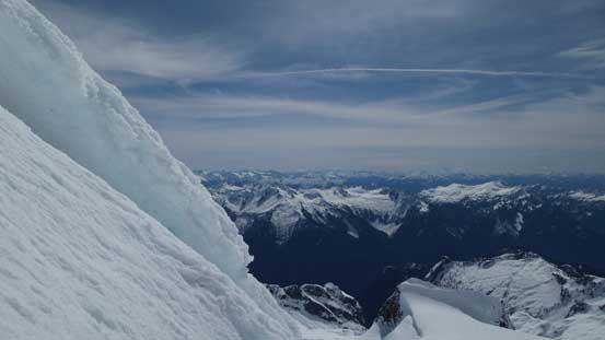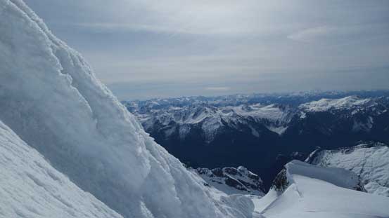 As I plodding up the foreshortened Sulphide Glacier the appearance of that infamous “summit pyramid” was getting more and more impressive. In short words – it’s looking STEEP… The first sight of it made me glad to have hauled my technical ice tool up there. At the base of it I ditched snowshoes and other unnecessary gears, picked up the set of boot tracks and up I went. The two ice axes soon became handy as the slope increased to 45 degrees in no time. But again, with those pre-set boot tracks it was a “mountain highway” to me. Near the top the grade steepened even further and then the couloir narrowed down into a series of rime ice channels. The previous guys went up climber’s right side which involved one strenuous move to hit the very upper reach of SE Ridge. The super duper exposed ridge was then easily followed to the summit. There’s a huge sense of satisfaction to be standing up there.