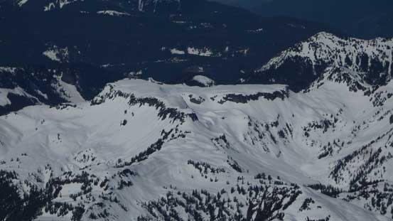 The Hell’s Highway was then easily down-climbed and the Upper Curtis Glacier was easily traversed (bit frustrating thank to the elevation regain). Down the Winnie’s Slide and then onto the White Salmon Glacier I could see those skier’s tracks were still in the boot-packing form (condition was pretty horrible for skiing indeed). I continued on foot for another few hundred meters down White Salmon Glacier before the post-holing finally took over and then I strapped my snowshoes on. The rest of the plunge (close to 1000 vertical meters) down into White Salmon drainage was fast and fun, but at this point I was definitely not looking forwards to the 250-m elevation regain.